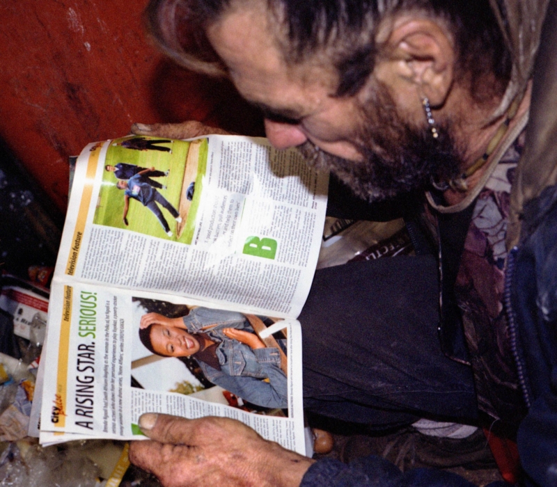 As the sun rises, Annetjie Botha is the last drop off. Standing on a intersection on a quiet Sunday morning she stands stoically clutching a pile of newspapers. Keeping an eye out for the traffic flow, she crosses the road constantly, angling for a better position. She made R200 that day but sometimes only makes R80.They pay R600 for a tin shack at the back of a house. For a month Frikkie also lived there but left when he couldn’t afford to pay R400 for a mattress, cordoned off by curtains, in a garage shared with 6 others. He has since moved back to the sloot.