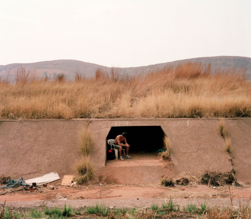 A few hundred metres away from their tent, across the bulldozed stretch of veld, Frikkie Botha (29) lives with a friend in a sloot – a concrete storm drain under the Mabopane Highway. Frikkie moved in with his friend 3 months before. They live 20 metres into the drain. Frikkie’s bed is a damp mattress. Looking much like a gothic teenage boy’s room there are water stained magazine cut-outs of Afrikaans poppies, and charcoal scratchings of the names of various previous inhabitants, swear words and crude drawings of women graffiti the walls.
