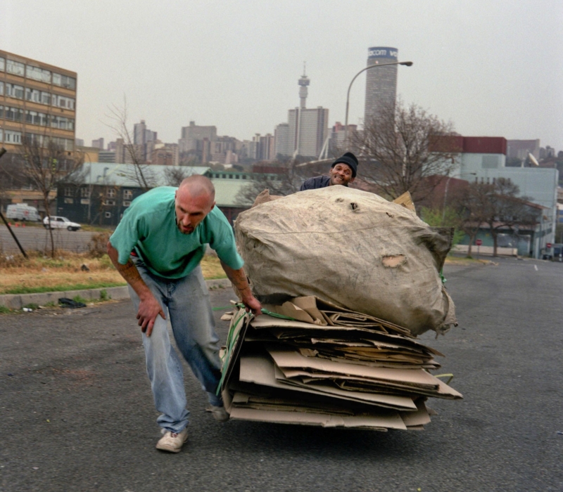 His most fertile gathering ground is the OK bazaars in the centre of Danville, arriving at 7 at night he waits ‘til closing time at 8.30 to start basic sorting out the boxes and plastics. Ripping off staples and stickers, folding them into smaller piles. Later he will sweep the parking lot and bin area. The well-to-do OK owners respect the work he is doing, “No one is allowed to call him Satan here. He does a good job.” They pay him with a loaf or 2 of bread and a frozen braai pack of meat.